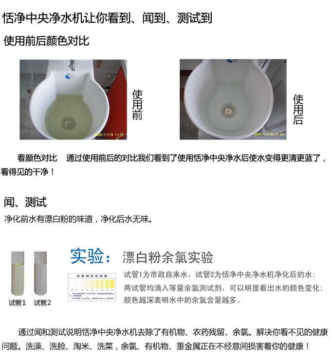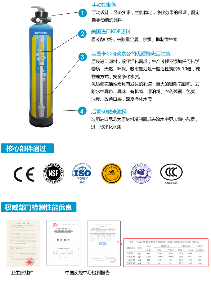 手動全屋中央凈水機有效去除水中的異色、異味;進一步濾除水中微小雜質、膠狀體;去除水中的漂白粉余氯、農藥、重金屬;保留對人體有益的礦物質。使水變得碧清、碧藍,去除對人體有害的物質。